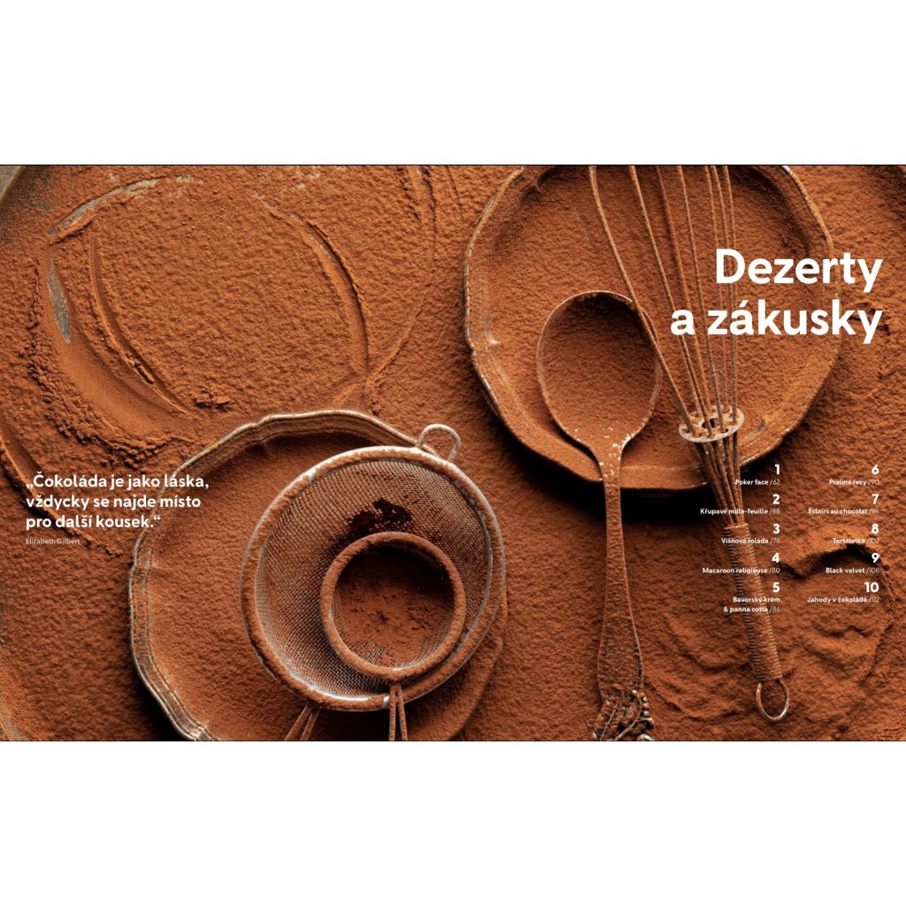 Neuvěřitelných 450 stránek dechberoucích zážitků. Cesta lemovaná mými vlastními recepty vás zavede do tajemného světa čokolády, kde jen samotné přivonění laská všechny smysly. Recepty rozepsané krok po kroku a stovky doprovodných fotografií vám umožní upéct luxusní čokoládová díla s lehkostí a vášní. Díky přehlednosti a detailnosti každého receptu snadno zvládnete i ty nejsložitější techniky profesionálního chocolatiera. V knize vás čeká čokoládová vánočka i nádherně nadýchané mléčné housky. Každé kousnutí do kakaového chleba Pain au cacao nebo do plněných tortelini způsobí výbuch rozkoše. Nechybějí ani delikátní kreace francouzské patisserie, jakými jsou eclairs nebo macarons. Své blízké ohromíte na přípravu snadnými dorty, luxusními bonbony nebo hříšnými lanýži. Čokoládové putování smyslným světem uzavírají sametově hedvábné pomazánky, lahodné horké čokolády a opojné likéry. Díky jedinečným receptům této kuchařky se každý z vás může stát mistrem své kuchyně. Ponořme se spolu do ultimátního potěšení z noblesní, božské, a především návykové ingredience – čokolády. S největší a nejkomplexnější knihou, která kdy byla o pečení s čokoládou sepsána.
