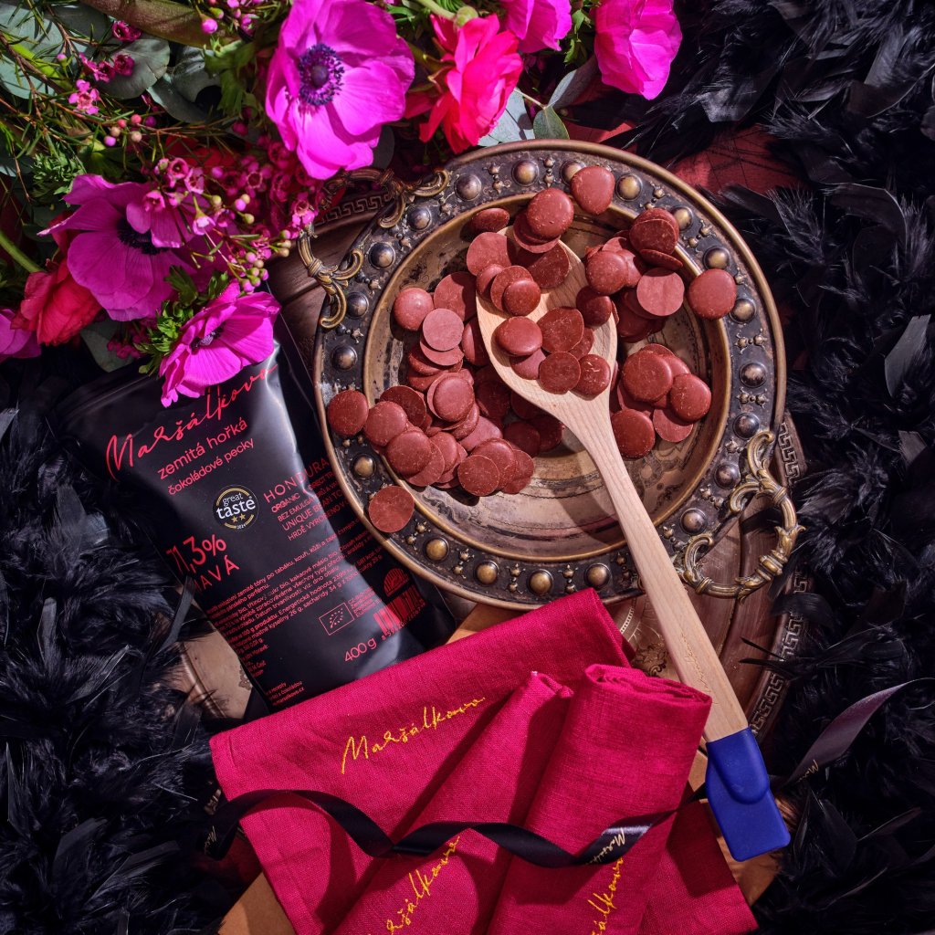 Oceněné hořké čokoládové pecky z výběrových kakaových bobů • Poctivá dřevěná vařecha Mason Cash se stěrkou • Třešňově červené lněné utěrky z Oderských vrchů