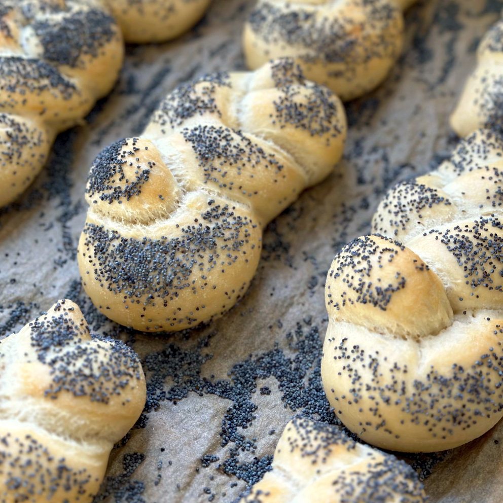 Plech: 30 × 40 cm Těsto: 275 g hladké mouky 100 g bílého jogurtu 50 g mléka 65 g másla 10 g droždí 1 vejce (M) 45 g cukru krupice 4 g soli 4 g mletého kardamomu 3 g muškátového oříšku Jogurtový krém...