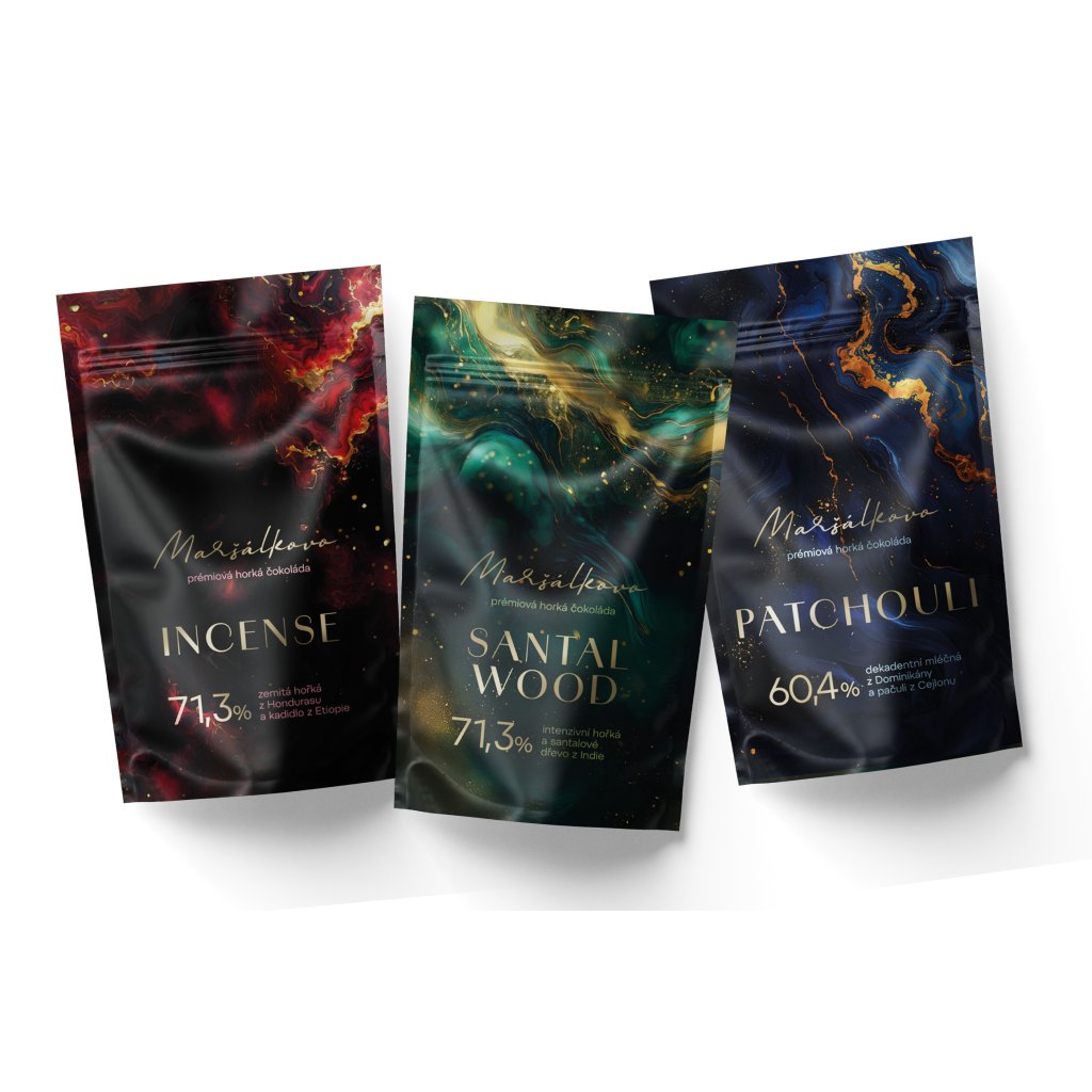 Tři unikátní horké čokolády aromatizované přírodními esencemi. Pravá hedvábná čokoláda pro váš jedinečný rituál. Krásný dárek nejen k Valentýnu.