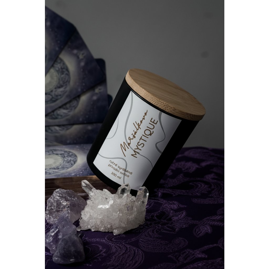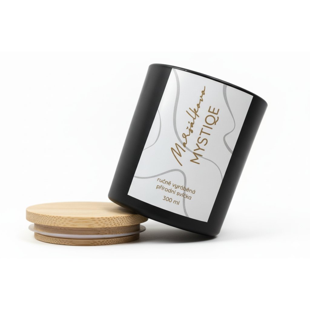 Luxusní svíčka MYSTIQUE z kokosovo-sójového vosku s dřevěným knotem. Silná, hřejivá a lehce rumová vůně s výrazným akcentem kůže a smyslným pižmovým dozvukem. Hoří až 60 hodin.