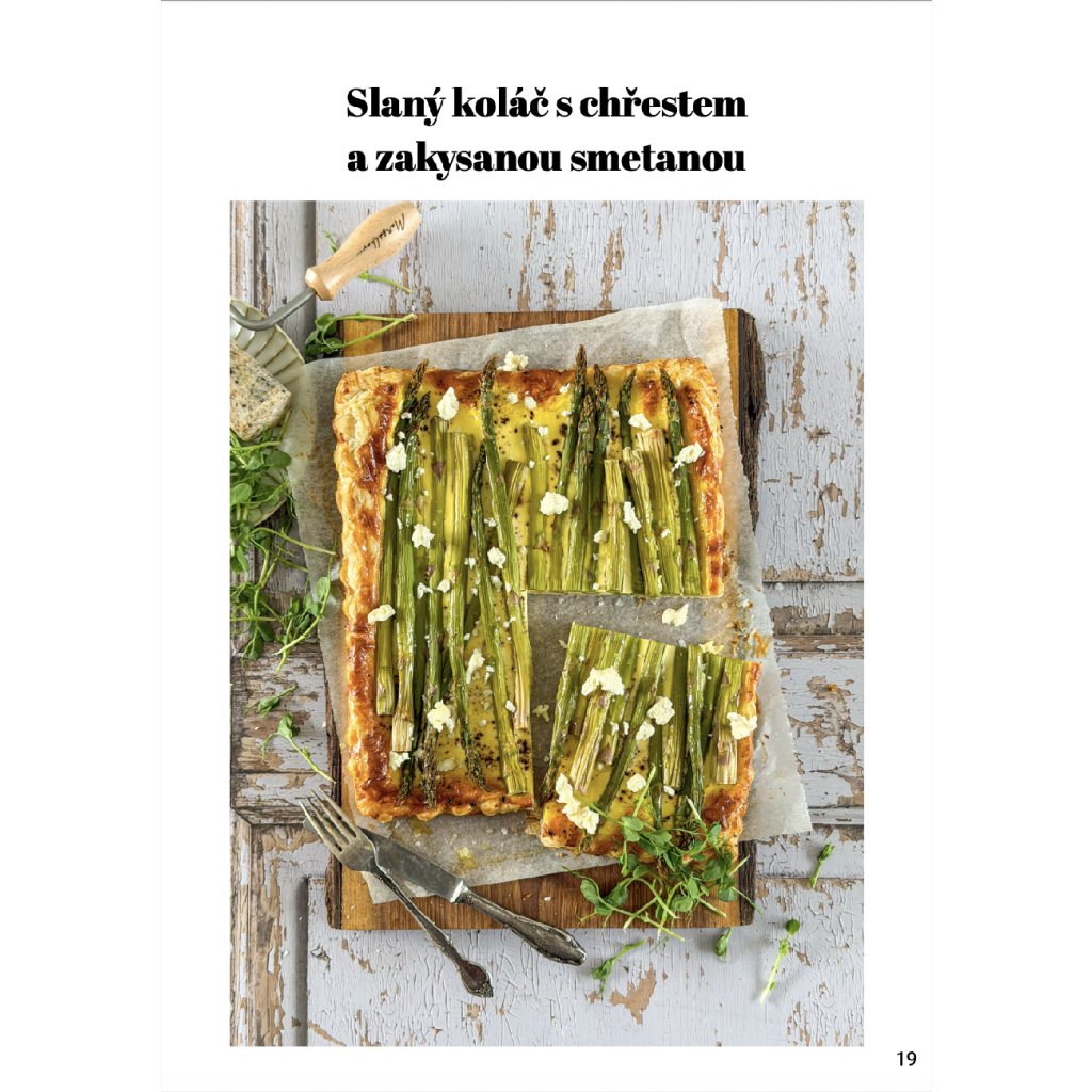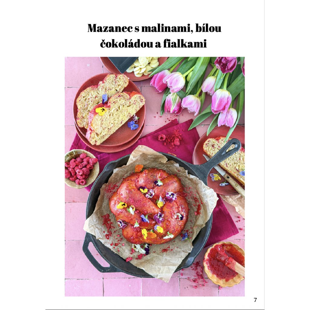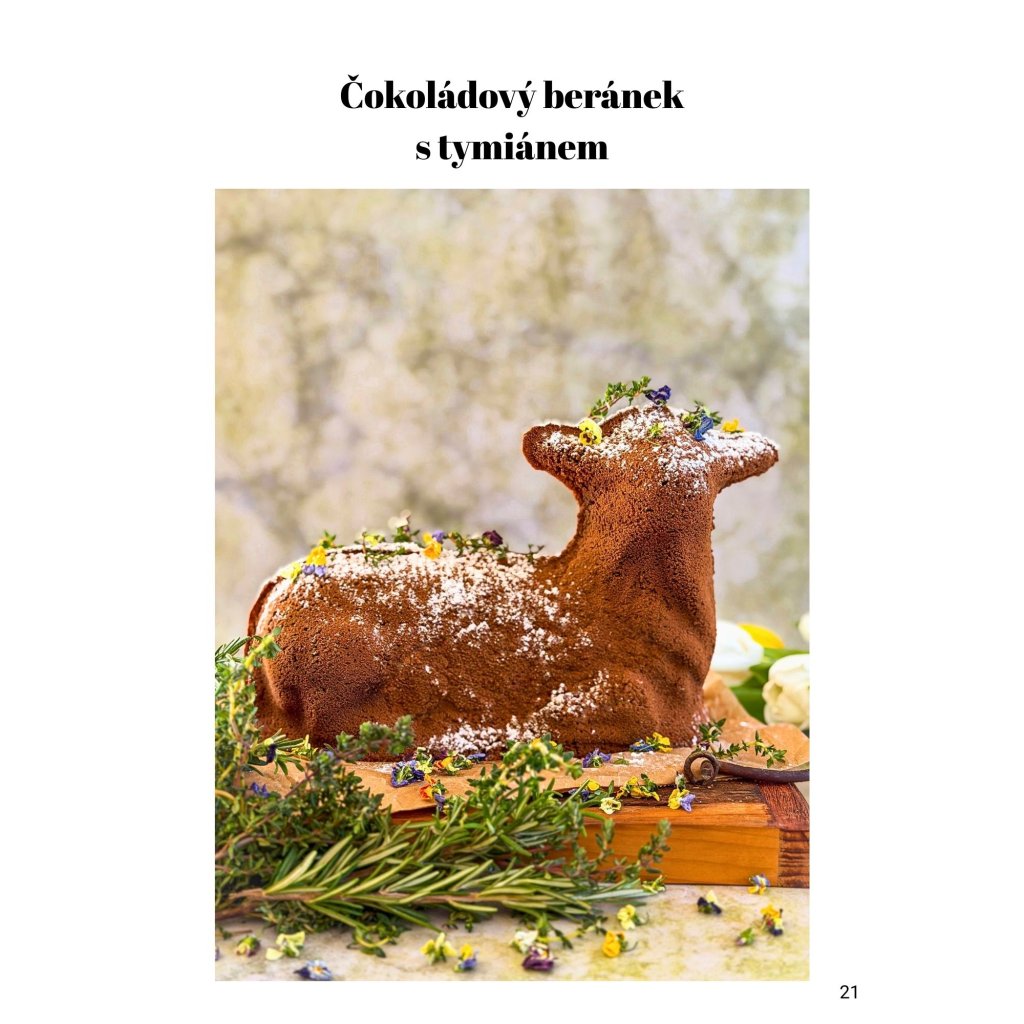 Najdete v něm například čokoládového beránka s tymiánem, mazanec s bílou čokoládou, malinami a fialkou, jemnou babettu z čaje matcha, slaný koláč s chřestem nebo chlebíček s chorizem a bylinkami. Přidal jsem také dva recepty z našeho Upečeno na dědině – špenátové koláče s rajčaty a pestem a křupavé olivové tyčinky.