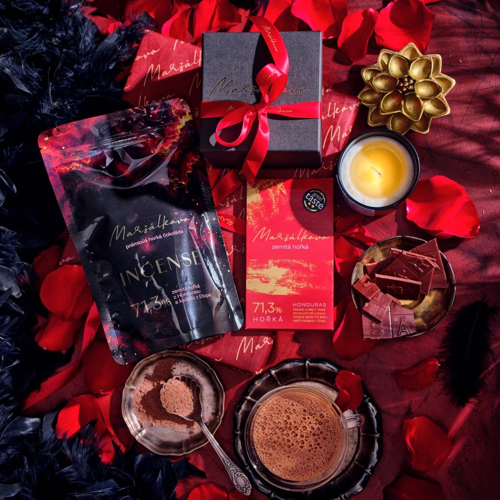 Dárkový set pro krásný večer ve dvou. Popíjejte mou luxusní horkou čokoládu v příjemném světle svíčky a k tomu ochutnejte mou oceněnou hořkou čokoládu. Vůně, oheň a čokoláda. Svíčka MYSTIQUE, hořká tabulka čokolády a horká čokoláda s kadidlem společně tvoří rituál, který zpomalí čas a dovolí vám být spolu.
